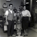 Gus Garrido posing with bowling trophies at a Humble Oil and Refining Company event, while his wife stands beside the trophy cabinet.