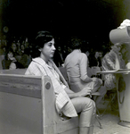 Gus Garrido's wife watching him bowl from the audience at a Humble Oil and Refining Company event.