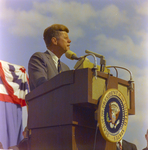 President John F. Kennedy speaks at a podium at Al Lopez Field during his visit to Tampa.