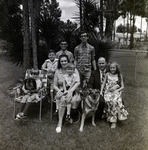 A group photo of John Burgess and his family sitting outside with their dogs.