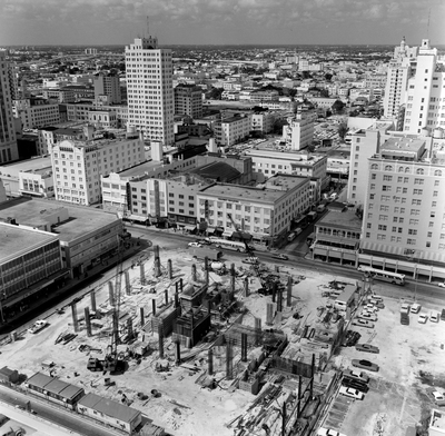 A construction site containing rebar and cranes for First National Bank of Miami in Miami, Florida. Photographed for Florida Steel Corporation.