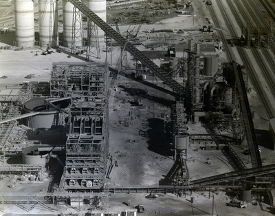 An aerial view of a phosphate plant in Fort Lauderdale, Florida, undergoing construction by the Florida Steel Corporation.