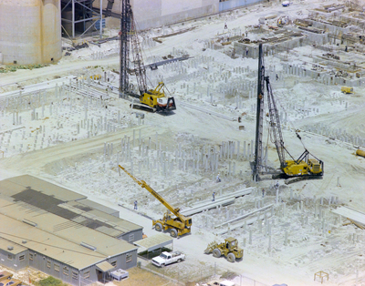 An aerial view of an industrial construction site with multiple cranes and pile driving equipment. Concrete pilings are arranged in the ground, and construction vehicles and buildings are visible.