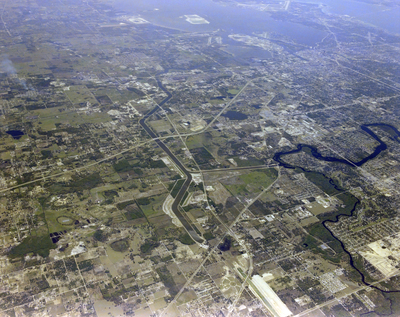 A high-altitude aerial photograph of Temple Terrace and East Tampa, featuring the city, various land areas such as construction and agriculture, and a river flowing through.