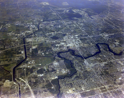 A high-altitude aerial photograph of Temple Terrace and East Tampa, featuring the city, various land areas such as construction and agriculture, and a river flowing through.