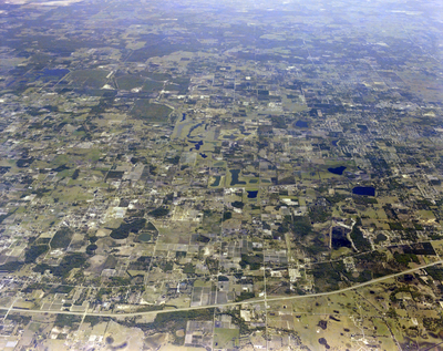 A high-altitude aerial photograph of an area featuring various land types, including construction and agriculture, with numerous small lakes scattered throughout.
