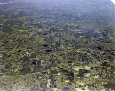 A high-altitude aerial photograph of an area featuring various land types, including construction and agriculture, with numerous small lakes scattered throughout.