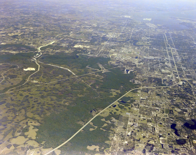 A high-altitude aerial photograph of Tampa featuring a forested area, an extensive road network, and cities in the background.
