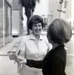A woman giving a woman a Master Charge card on a sidewalk in Downtown Tampa, Florida, for Exchange National Bank.