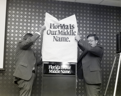 Duncan Fletcher, president of the Quincy branch of First Florida Bank, and an unknown employee place a cloth bag over a sign for First Florida Bank that says "Florida is Our Middle Name" at a company event. The same catchphrase is on the cloth bag.