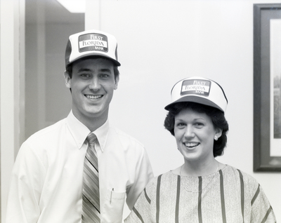 Gandy, George Skip IV, "Two Employees Pose Wearing Company Hats, First Florida Bank Event, B" (1986). Gandy Photographs - Commercial. Image 4633.