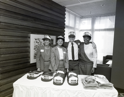Gandy, George Skip IV, "Four Employees by Merchandise Table, First Florida Bank Event, Sarasota" (1986). Gandy Photographs - Commercial. Image 4850.