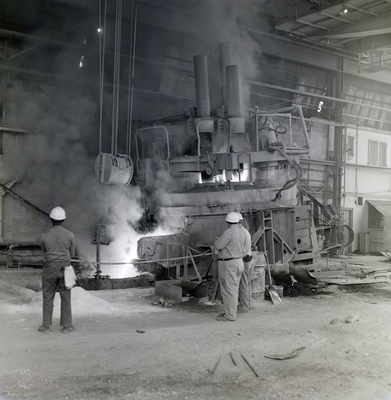 Gandy, George Skip IV, "Three Employees by Steel Furnace, Florida Steel" (1960). Gandy Photographs - Commercial. Image 4961.