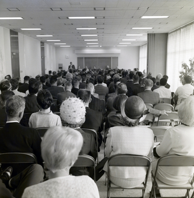 A view of the audience from the back of the room while Edward Flom, CEO of Florida Steel, gives a presentation during a Florida Steel annual meeting held at the Exchange National Bank of Tampa.