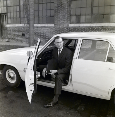 Gandy, George Skip IV, "Man in Suit Exiting Vehicle, Florida Steel, B" (1960). Gandy Photographs - Commercial. Image 5096.