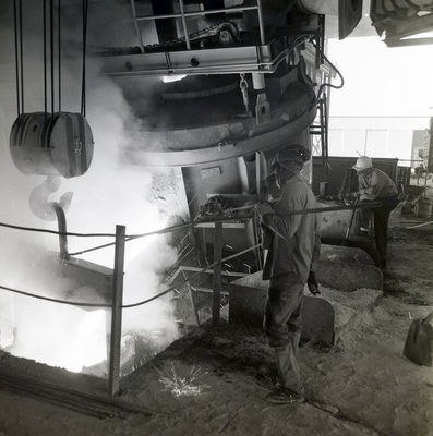 Gandy, George Skip IV, "Employee Placing Metal Rod in Furnace with One Other, Florida Steel, A" (1960). Gandy Photographs - Commercial. Image 5152.