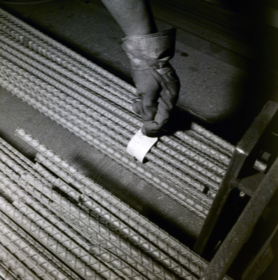 Gandy, George Skip IV, "Employee Adjusts Tag on Rebar in Machine, Florida Steel, C" (1960). Gandy Photographs - Commercial. Image 5211.