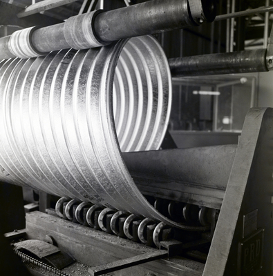 A close-up view of a spiral culvert machine at a Florida Steel factory.