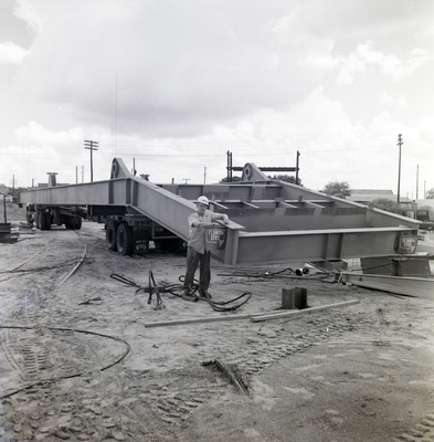 Gandy, George Skip IV, "Employee and Longest Segment of Prefabricated Steel on Site, Florida Steel, A" (1960). Gandy Photographs - Commercial. Image 5400.
