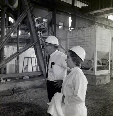 Robert J. Bodeman and an unknown woman stand next to each other during a fashion shoot at a Florida Steel plant.
