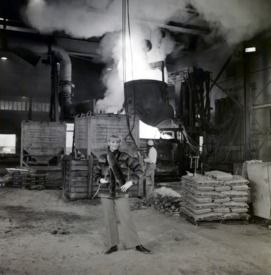 A model poses by an active furnace for a fashion shoot at a Florida Steel plant.