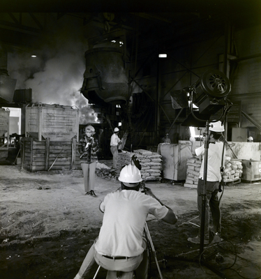 A view from behind the cameraperson and light crew as a model poses in front of an active furnace for a fashion shoot at a Florida Steel plant.