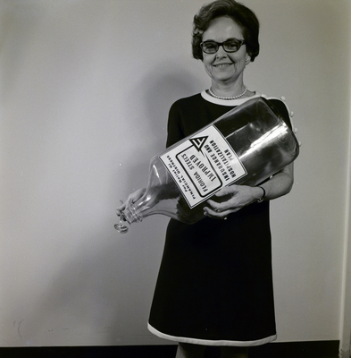 A Florida Steel employee holds a large, empty bottle with a label that says "For relief of financial distress, Florida Steel's Improved Insurance and Hospitalization Plan" .
