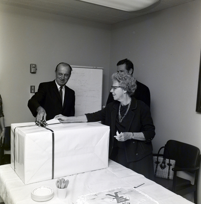 Gandy, George Skip IV, "Woman Unwraps Gift at Florida Steel Office Party, B" (1960). Gandy Photographs - Commercial. Image 5492.