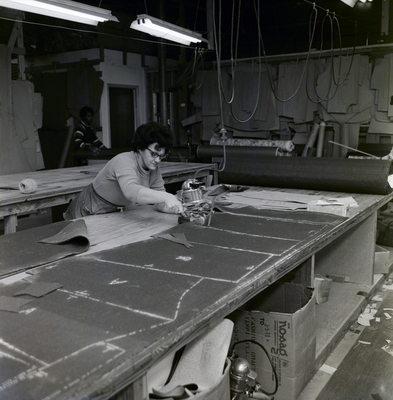 Gandy, George Skip IV, "Employee Cuts Fabric at Workstations, Fashion Craft Furniture, A" (1975). Gandy Photographs - Commercial. Image 5630.