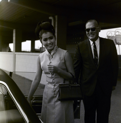 Apasra Hongsakula, Miss Universe 1965, stands by the open door of a vehicle during a visit to a JM Fields location.