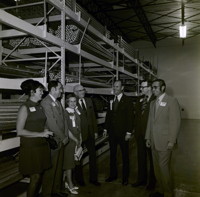 Seven attendees socialize near shelves holding metal rods during a Fife Florida Electric Supply Company Event.