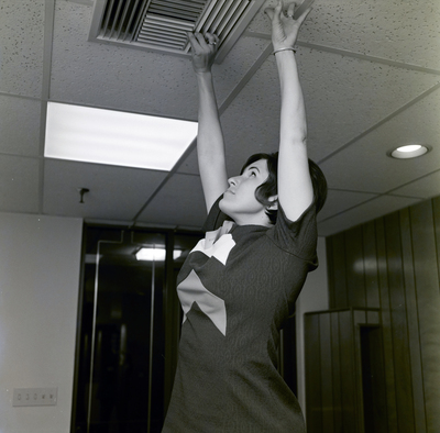 A hostess at a Fife Florida Electric Supply company event reaches up to an air vent on the ceiling and adjusts it.