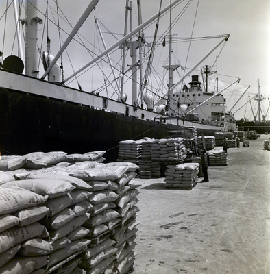 Cranes on the motor vessel California Sun loading pallets of bagged products on board for Fillette Green.
