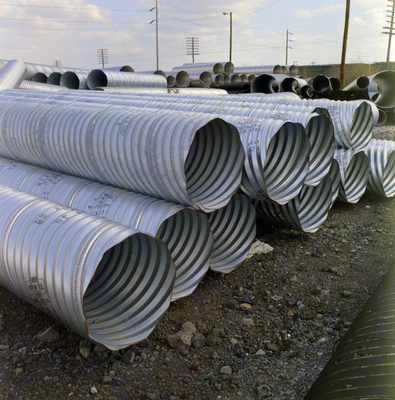 A stack of corrugated steel pipe from Florida Steel Corporation.