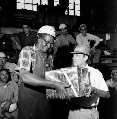 Gandy, George Skip IV, "Warehouse Workers with Wrapped Gift, Florida Steel Corporation, D" (1970). Gandy Photographs - Commercial. Image 6116.