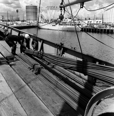 The shipping department of Florida Steel Corporation preps a ship with materials at a dock.