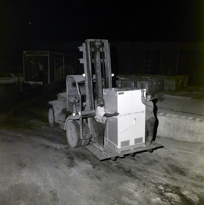 Gandy, George Skip IV, "Unloading Computer Using Forklift for Florida Steel Corporation, J" (1970). Gandy Photographs - Commercial. Image 6240.