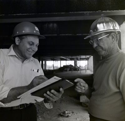 The project manager and a construction worker at a Florida Steel Corporation construction site.