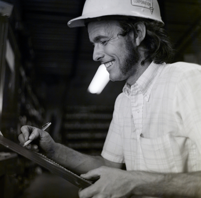 A worker takes notes at Florida Steel Corporation's electric steel mill in Indiantown, Florida.