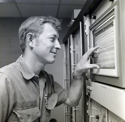 An office worker adjusts a machine at Florida Steel Corporation's electric steel mill in Indiantown, Florida.