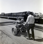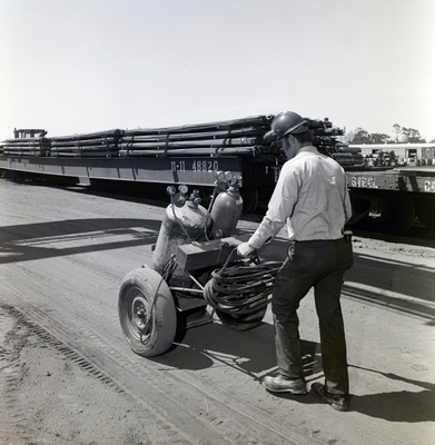A Florida Steel Corporation employee seen wheeling over equipment to site.