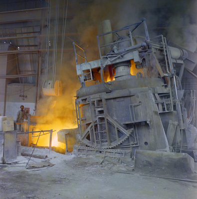 Two employees working the furnace at the Florida Steel Corporation facility.