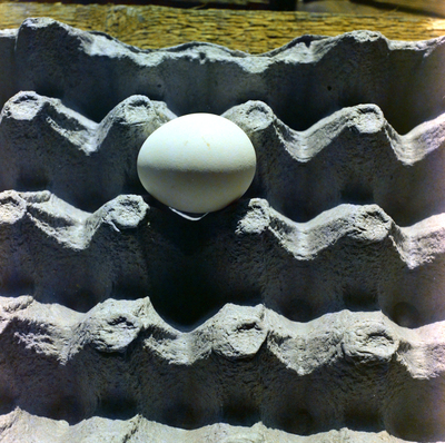 An egg laying sideways in a flat, cardboard egg crate. Photo taken for Fowler and White.