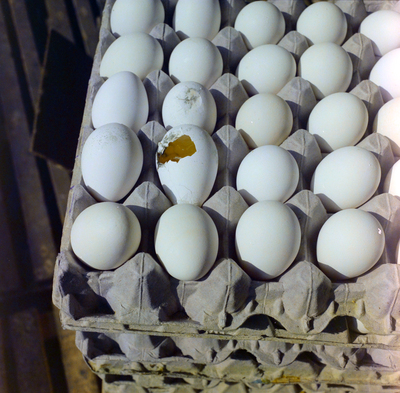 Thirty eggs in a flat, cardboard egg crate, sitting on a stack of other egg crates. Three eggs on the left have been cracked and damaged. Photo taken for Fowler and White.