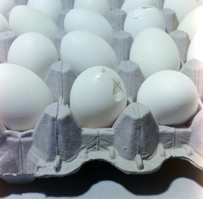 Close up of flat of eggs. Two of the eggs are cracked and damaged. Photo taken for Fowler and White.