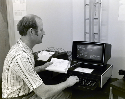 Gandy, George Skip IV, "General Telephone and Electronics Corporation Employee at Computer" (1970). Gandy Photographs - Commercial. Image 7318.