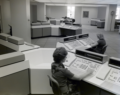 Women sit at workstations with equipment at General Telephone & Electronics Corporation.