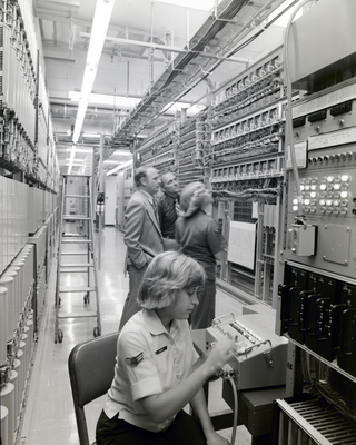 An Air Force employee reaches among electrical equipment while two men speak behind her. This photograph was commissioned for General Telephone & Electronics Corporation.