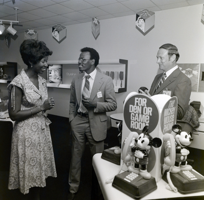 Two unidentified men and a woman stand chatting in front of a display with a Mickey Mouse phone produced by General Telephone & Electronics Corporation.