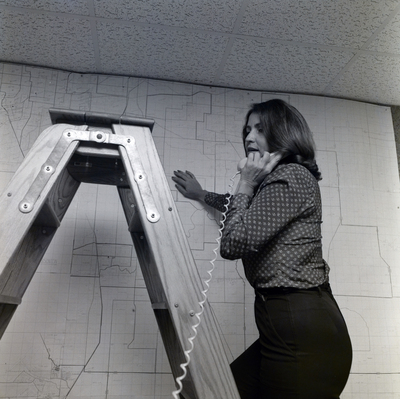 Gandy, George Skip IV, "Woman Speaks on Phone on a Ladder next to Map, M" (1970). Gandy Photographs - Commercial. Image 7465.